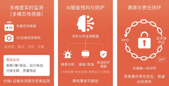 高价值货物运输中,“风险突发” 往往让人措手不及。方案通过集成温湿度、振动、位移、电压等多模态传感器,实时采集冷链生鲜、新能源动力电池等货物运输数据,AI 算法通过分析数据特征,提前识别温度异常、电池泄漏、剧烈冲击等隐患,同步触发冷链报警、减震防护等措施,将安全风险扼杀在萌芽阶段。 亮点三:“区块链 + DPP(产品数字护照)” 打造全流程数据铁证