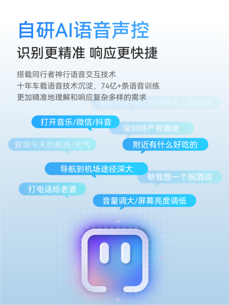 四、前沿AI大模型,打造智能“大脑” 车机搭载前沿的AI大模型(包括deepseek、豆包等),赋予车辆强大的自然语言理解、知识储备与场景化服务能力。只需通过“你好,小T”+指令词唤醒,AI大模型即可精准理解车主需求,提供智能、贴心的服务,让您的爱车成为行车途中的“智能管家”。 五、语音交互更精准,嘈杂环境也能清晰通话 车机搭载超精准自研AI语音系统,支持导航、听歌、接打电话、空调控制等功能的语音操作。采用双数字麦克风降噪技术,有效过滤风噪和发动机噪音,高速行驶时仍能精准识别语音指令,确保双向通话清晰流畅,提升行车安全与便捷性。
